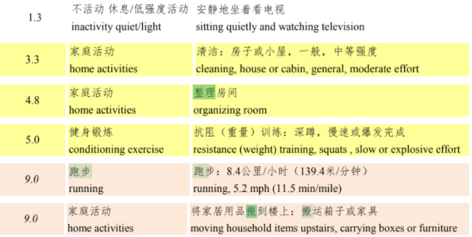 链接里是亚利桑那州立大学和美国国家肿瘤研究所合作的 身体活动 METs 表,该表被众多研究论文引用。不仅仅如此,大保认为该表活动覆盖十分丰富,从健身锻炼,家庭活动,职业活动,以至于宗教活动等一共21个分类都有涉及。非常适合同学们更好的理解日常生活中不同活动的卡路里消耗。大保在这里摘抄了中文版中几个日常活动的代谢当量,注意这只是冰山一角,整个表格一共有超过1800个项目。