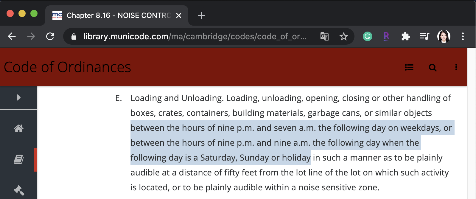 搬家时间的限制主要来源于每个城镇的Operation Hour,由于搬家的货车属于大型机械,会造成噪音,所以应该在Operation Hour规定的时间内进行。疫情期间麻省在搬家的时间还是和正常一样由每个城镇自己制定,大部分是早9点到晚7点。查看各个城镇的Operation Hour,下图为Cambridge的要求。