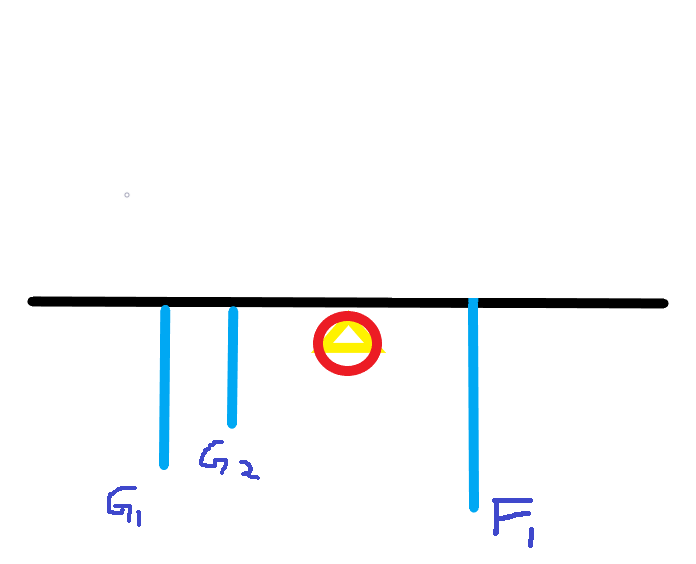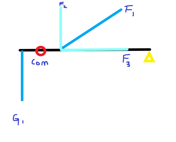 在弯腰这个姿势中,人体仅仅是弯曲髋关节(大腿和腰的连接处)和腰椎,抵达我们所需搬运的物体。从下面的一个受力简图中,我们可以看出腰部在这个动作是主要发力及受力部位。F1是腰背部肌肉用以拉起重物和上半身G1的重量的力。Com(center of mass) 是这个杠杆的重心所在,黄色三角形是这个杠杆的支点,也就是髋关节。